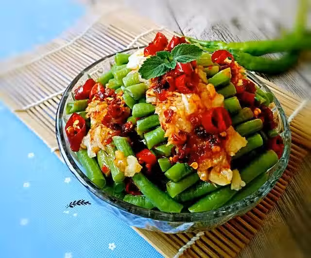 4.鍋中水開後放入少許鹽一小勺香油把豆角放入大火煮兩到三分鐘。豆角煮熟後撈出過兩遍涼水,撈出淋干水切小段,放入盤中