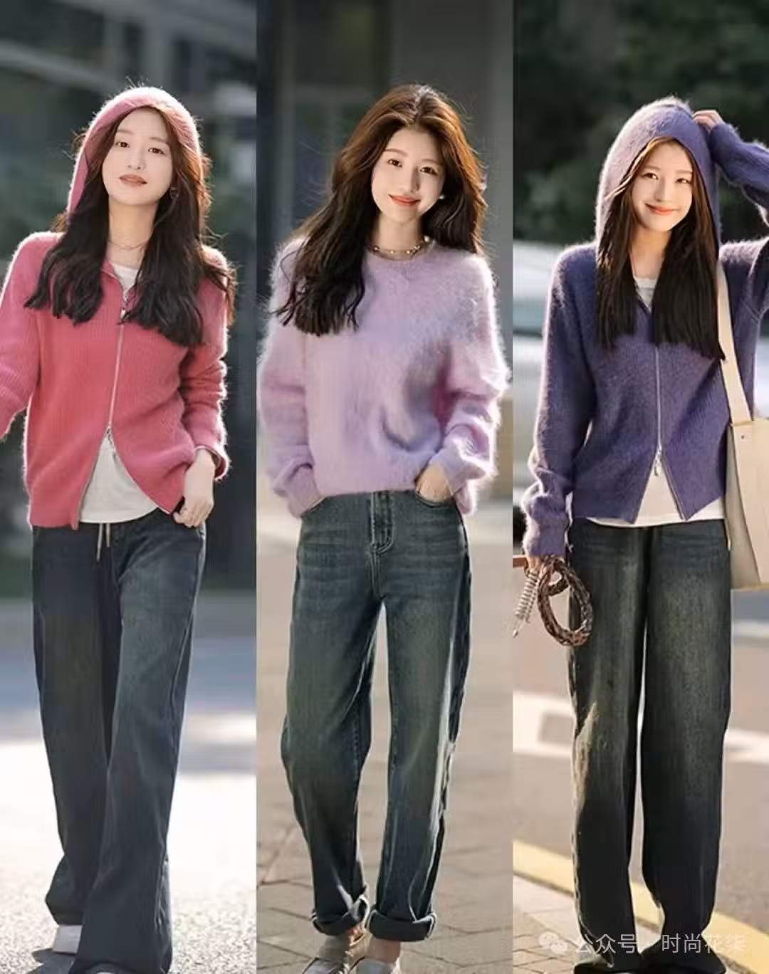 淡淡的香芋紫色的馬海毛毛衣,給人一種特別明媚的搭配,因為它屬於冷色調,膚色偏暗的女生也可以嘗試,搭配懷舊色的牛仔褲,帶著一種青春的朝氣與新鮮感,非常適合過年穿。