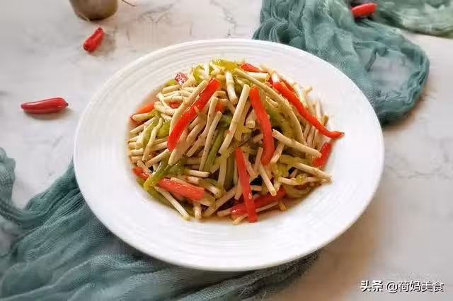 3、腌好後倒掉多餘的水分,加入生抽,白糖,醋,辣椒油拌勻,拌勻後稍腌制10分鐘,裝盤即可。