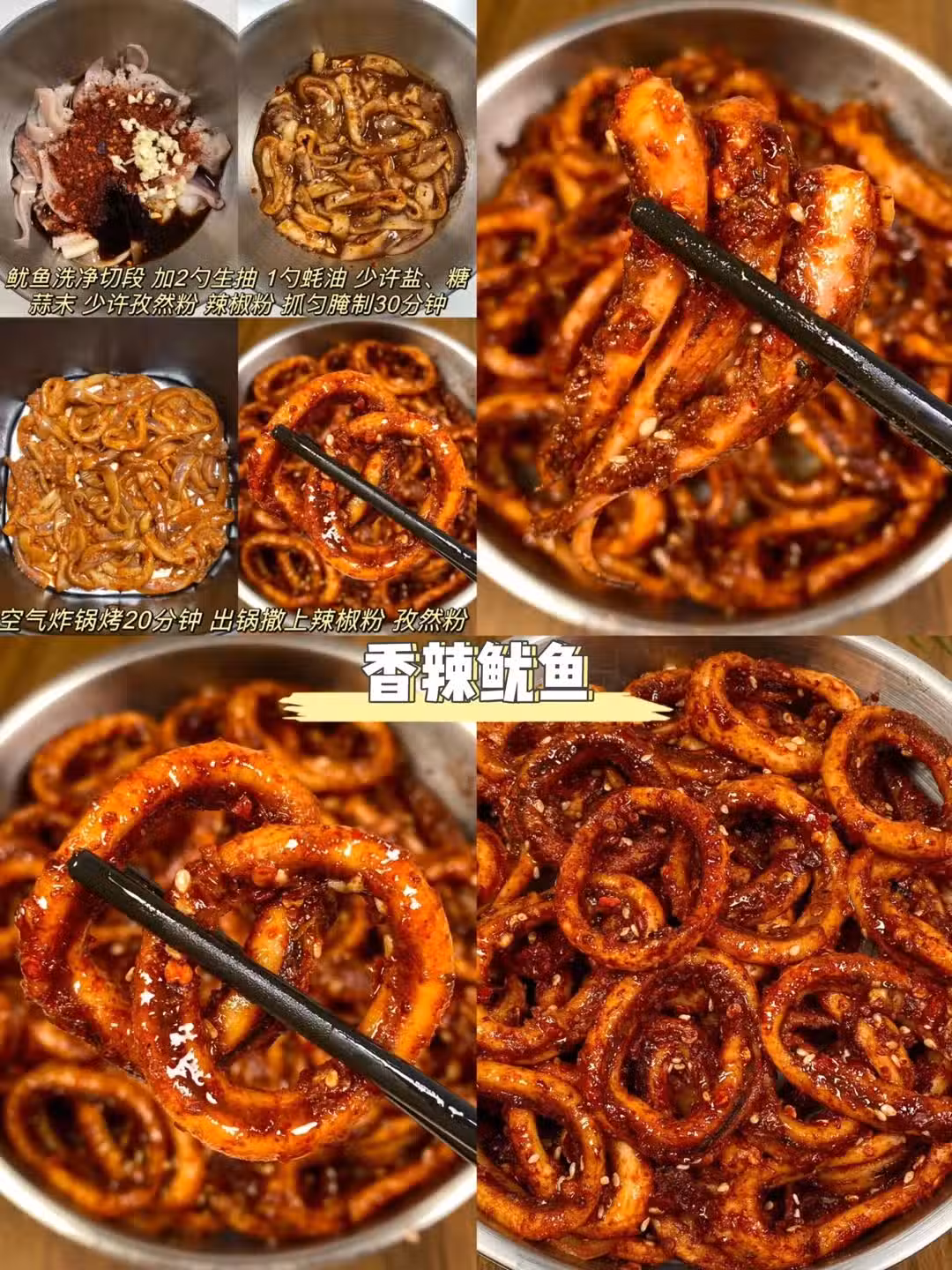 腌制完畢的魷魚放入空氣炸鍋中,調至180度烤制20分鐘。這樣烤制出的魷魚既能保持魷魚本身的嫩滑,又有了烤物特有的焦香。出鍋後,為了讓口感更上一層樓,再撒上一層辣椒粉和孜然粉,以增強魷魚的香氣和辣味。