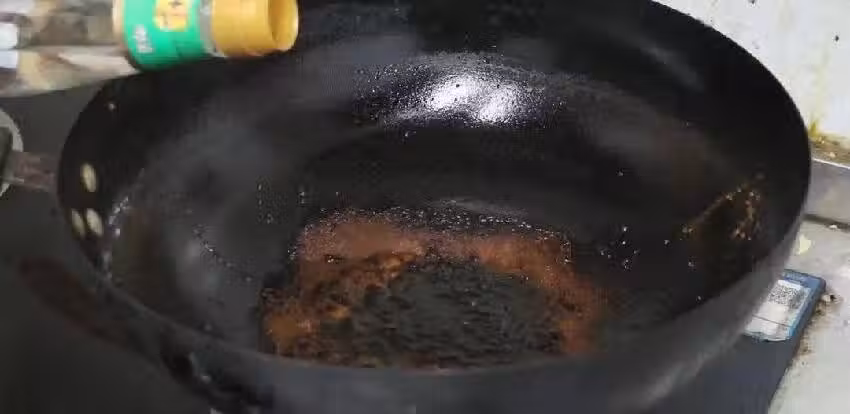 平常我們在炒完菜的時候,可能會放上一些蚝油,或者說是這種黃豆醬菜,炒完之後鍋底就會有這種糊糊的黑垢。