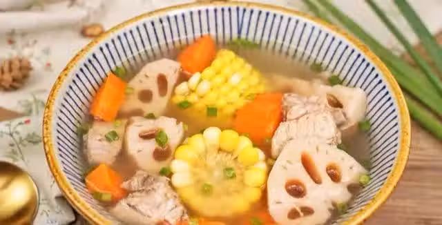 2、玉米、蓮藕、胡蘿蔔全部清洗乾淨後切段,放進電飯鍋內,加入適量清水,剛好沒過排骨就好了,然後開始煮湯。湯煮好以後,加入適量的鹽,撒上蔥花就可以出鍋了。
