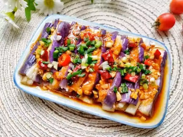 3:將把茄子放入蒸鍋中,大火蒸10分鐘,直至茄子變軟成熟,然後取出晾涼。