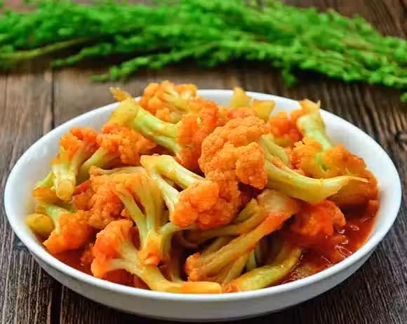 3、加入菜花翻炒均勻,加入鹽、糖、少許生抽調味,出鍋裝盤。