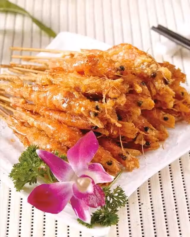 4、大蝦變色,撈出,穿串擺盤,撒上椒鹽。