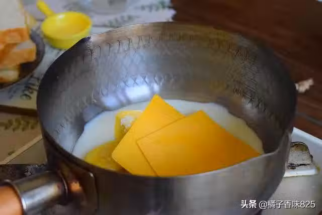 2、小火加熱,一邊加熱一邊攪拌,一直到奶酪和白糖全部融化,並且呈黏稠的狀態,就可以關火了。