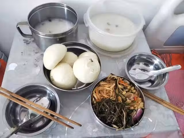 還有一次,我和老公去給他們送東西,那是中午,也是公婆在吃午餐,只見又兩碗小米粥,還有兩個地瓜,馬鈴薯燉胡蘿蔔,盤子裡有點炒牛肉。