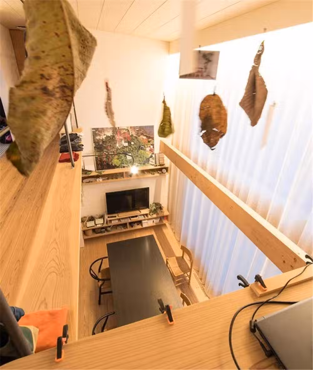 從這張辦公桌往下看,既可以看到一樓的餐桌和電視區,也可以與旁邊的懸空書桌進行「聯動」,有時候堀井在這里工作,妻子或是在旁邊疊衣服,或是在一樓做飯,那畫面別提多溫馨了!