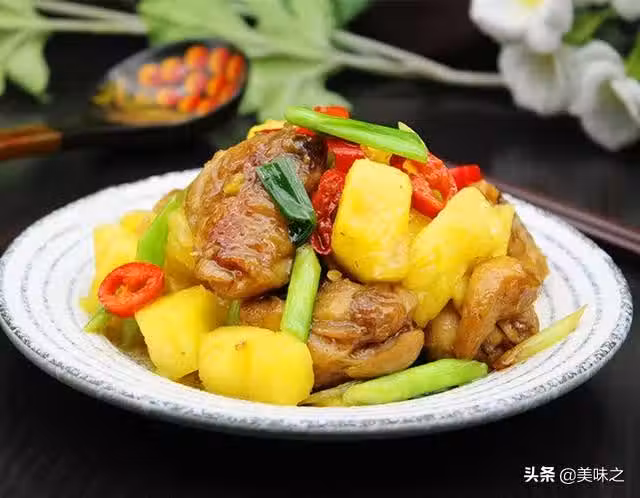 菠蘿1個、雞腿3個、花生油3ml、鹽5克、醬油2ml、料酒1ml、紅辣椒1個、蒜3根、生薑3克、白砂糖5克。