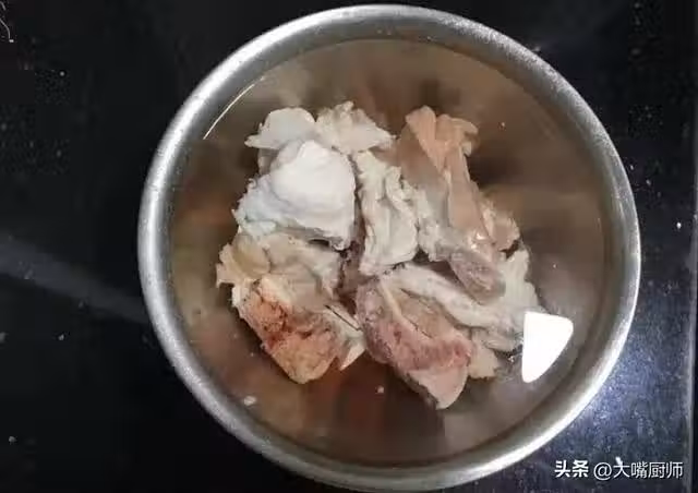 2、把剁開的大骨頭放入盆子裡,加入適量清水,再放一勺食鹽,浸泡1~2小時,把裡面的血水浸泡出來,這樣可以去除腥味,燉出來的骨頭湯不腥氣,湯色也不會發黑。