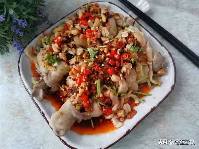 7.把蔥花、薑末、蒜末,泰椒圈一起放在碗內,把炸好的熱花椒油,淋入碗內,再加入鹽、生抽、米醋、白糖、香油、辣椒油,幾勺煮雞腿的雞湯,攪拌均勻,這樣口水雞腿的汁就調好了。