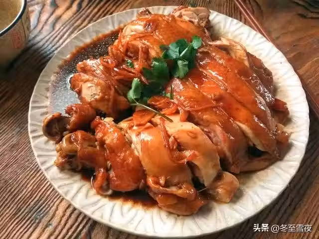 4.將雞腿剁成塊放在盤內,淋入適量湯汁即可。
