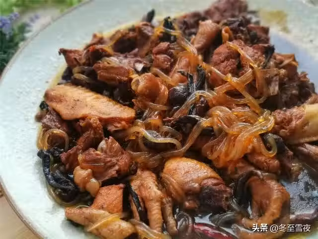 6.到時間後,下入粉條,加入鹽調味,繼續燉制,把粉條燉至變透明,關火,盛出即可,一道色香味俱全的小雞燉蘑菇就做好了。