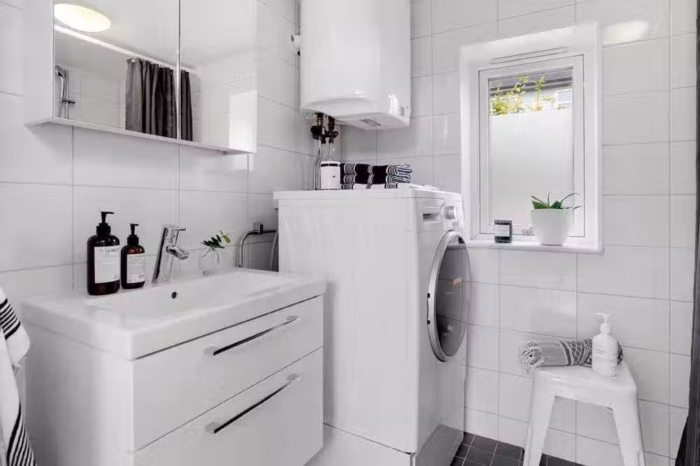 洗手台雖小,但是對小姐姐來說卻足夠使用,下面的豐富儲物空間,更為小姐姐的洗漱用品提供了安放的場所。為了更好地節省空間,小姐姐特意將洗手池旁邊的區域安放了一台洗衣機,平時洗衣服就再也不用自己動手啦。