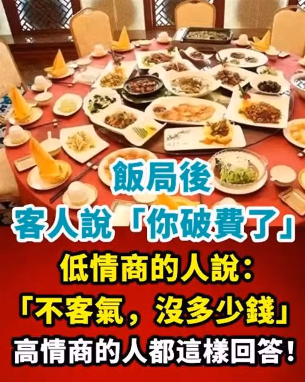 飯局後,客人說「你破費了」,低情商的人說:「不客氣,沒多少錢」,高情商的人都這樣回答!!
