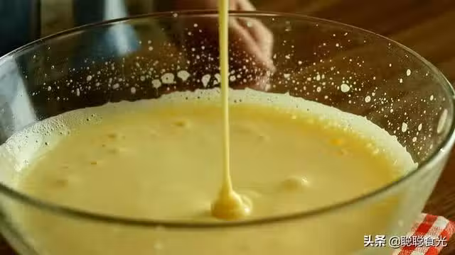 步驟三:打到蛋液顏色發白的時候,雞蛋糊慢慢變得濃稠,可以先提起來看一下,像這樣雞蛋糊流動性很強,流到盆中快速消失,這樣的狀態是絕對不行的,還需要接著開高速打發。