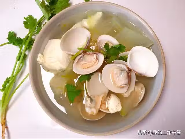 食材:豆腐100克 冬瓜100克、蛤蜊半斤 、香菜、鹽、胡椒粉、芝麻油