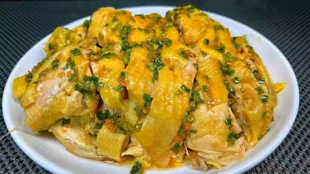雞肉蒸好後取出自然放涼,再斬成小塊,擺盤,再淋上提前調好的料汁就可以開吃了。