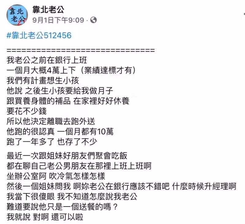 明顯被這句話傷到了原PO老公,還是收起難過安慰她:「好啦,再給我一點時間,等這些事情都處理完,存到錢,生完小孩把妳身體顧好,我們就去開個小店做小生意好嗎?」最後原PO也在文末大吐苦水,直說自己不是瞧不起外送員這個職業,只是希望老公可以找份體面的工作讓她有面子、自己也能舒服地坐在辦公室裡。