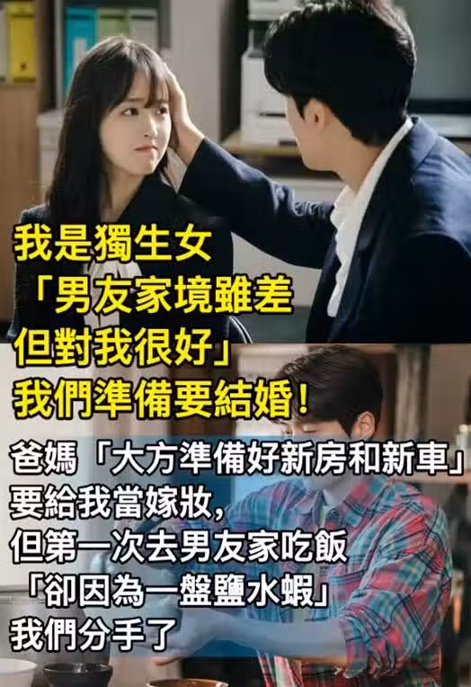 我是獨生女「男友家境雖差但對我很好」我們正準備要結婚! 爸媽「大方準備好新房和新車」要給我當嫁妝,但第一次去男友家吃飯「卻因為一盤鹽水蝦」我們分手了