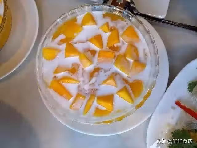 椰汁200克,芒果50克,芒果醬10克,西米50克,煉乳10克,冰塊3塊。