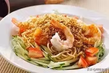 6、將麵條放入碗內,表面碼上熟蝦仁,黃瓜絲等,再淋上涼麵醬汁即可食用。