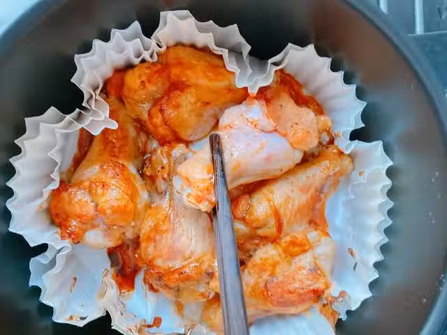 6、10分鐘之後,雞腿就熟了,下面油紙上的就是雞腿中多餘的油脂,用空氣炸鍋做出來的奧爾良雞腿,外酥里嫩,咬一口還有汁水,味道非常好;