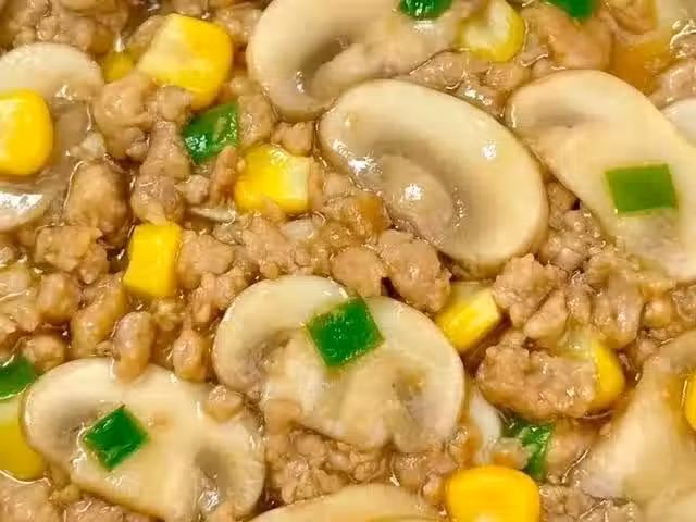 4、再次起鍋燒油,油熱後放入玉米粒和口蘑翻炒,炒至變色後放入肉末和醬汁,煮熟食材後大火收汁,撒上蔥花即可出鍋裝盤開吃。
