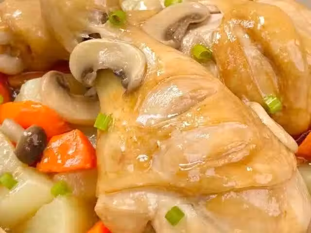 4、將炒過的蔬菜放在蒸碗底部,再放入腌制好的雞腿,蓋上錫紙,水開上鍋蒸五十分鐘。蒸熟後取出來,撒上蔥花點綴即可端上桌開吃。