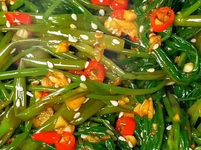 準備食材:空心菜,蒜末,小米辣,辣椒粉,白芝麻。