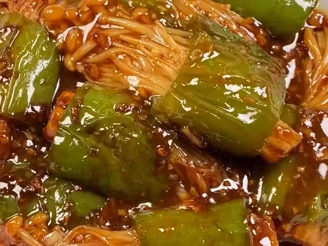 3、起鍋燒油,油熱後放入青椒金針菇煎一下,煎至表面虎皮狀,再倒入提前備好的醬汁燜煮一下,煮熟煮至醬汁濃稠即可出鍋裝盤開吃。