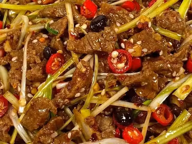2、起鍋燒油,油熱後放入腌制好的牛肉翻炒,炒至變色後盛出備用。3、再次起鍋燒油,油熱後放入蒜絲、蒜末,小米辣、豆豉、辣椒麵,翻炒一會兒炒香,然後放入食鹽、生抽、蚝油、白芝麻炒勻。