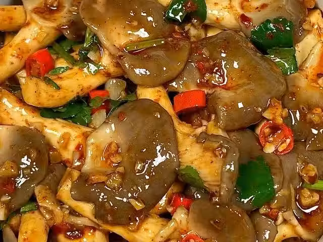 2、起鍋燒油,油熱後放入蒜末和小米辣炒出香味,再放入平菇翻炒均勻,加入生抽、蚝油和辣椒麵翻炒均勻入味。