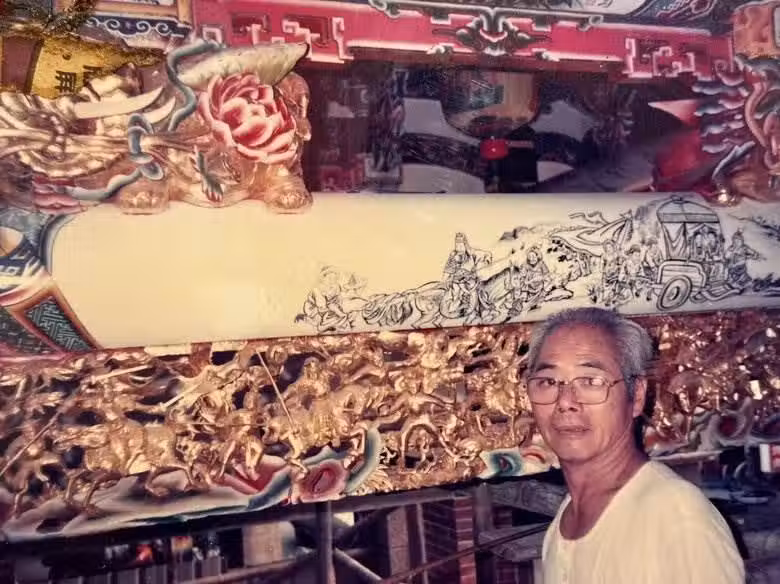 陳穎派藝師在鹿港城隍廟的畫樑合影。(陳穎派藝師家屬提供