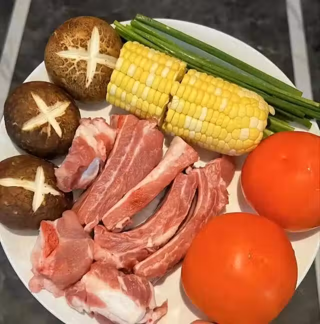 番茄炒出汁後加入切好的排骨,玉米還有香菇翻炒均勻。