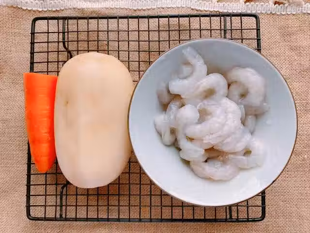 2、胡蘿蔔去皮之後切成丁,儘量切得碎一些,切好的胡蘿蔔大概有70g、蓮藕清洗乾淨之後去皮,切成藕丁,這裡用的是九孔藕,就是燉湯的藕,這樣藕丁煎熟時候是綿軟的口感,更適合老人小孩,藕丁大約是130g,配料的用量剛好等於蝦仁的用量,將準備好的蝦仁清洗乾淨之後,擠干水分,剁成蝦泥,可以用刀背剁碎,有勁道的同時還能保留一些顆粒感。
