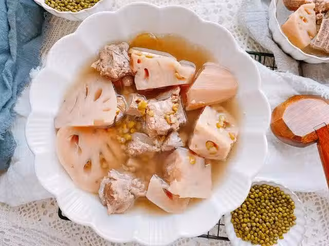 【原材料】蓮藕2節、綠豆50g、豬骨500g、生薑、食鹽、料酒;