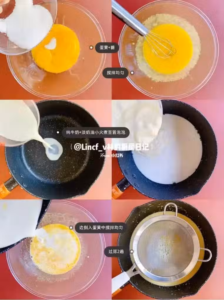 2.純牛奶+淡奶油拌勻,小火加熱至邊緣冒小泡泡,一邊加入蛋黃中一邊攪拌均勻