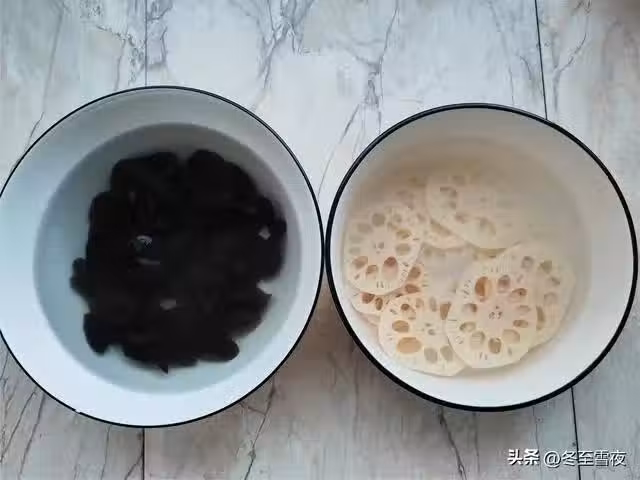 1.準備好所需材料,干木耳提前放到冷水中泡發半小時左右,把木耳泡發好,蓮藕颳去外皮,切成薄片,放到清水中,加入幾滴醋,這樣蓮藕的顏色就不會氧化變黑。