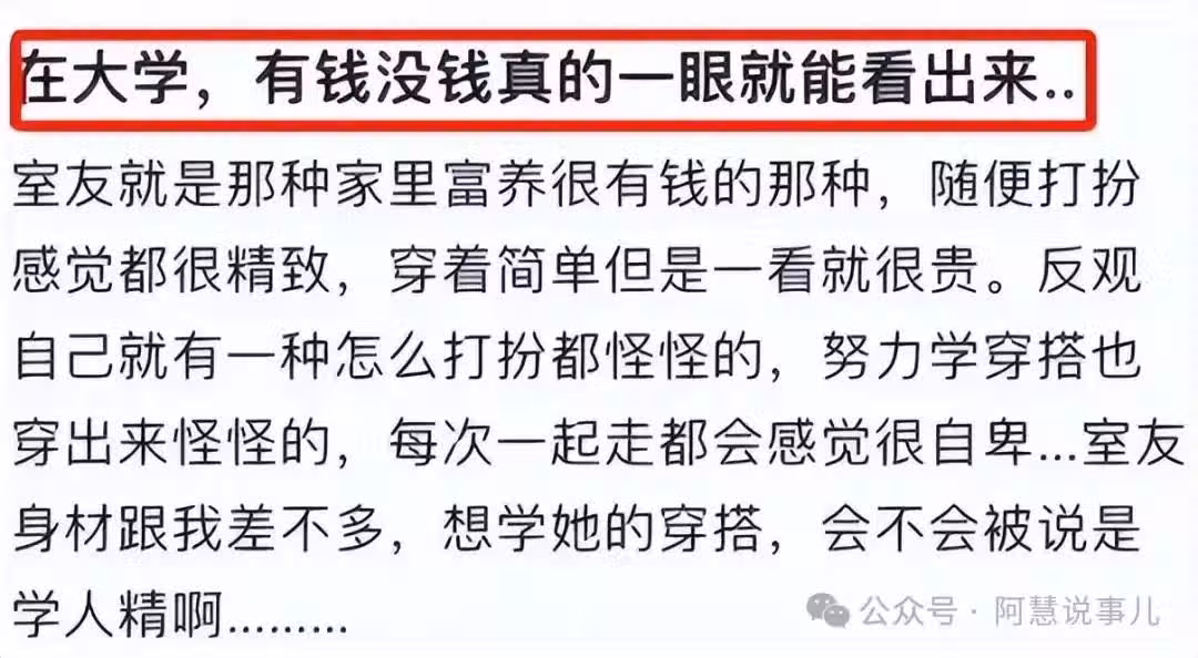 有的人認為通過衣服判斷學生的家境是否過於片面,但其實不是,有很多學生都開始曬出自己的經歷,她們一致表示「在大學裡面,富家女和普通女生是不同的」。