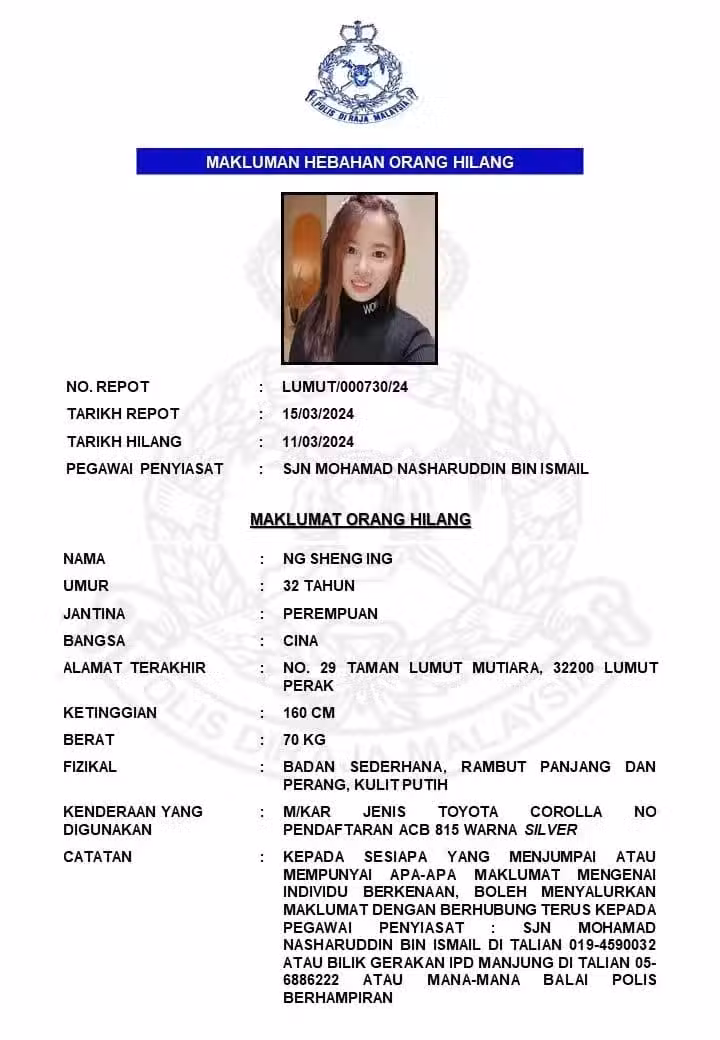 曼絨警方今午在曼絨警區的面子書發貼尋人,指一名32歲華裔女子黃馨瑩(Ng Sheng Ing)自3月11日起便失蹤,警方於3月15日接獲相關投報。