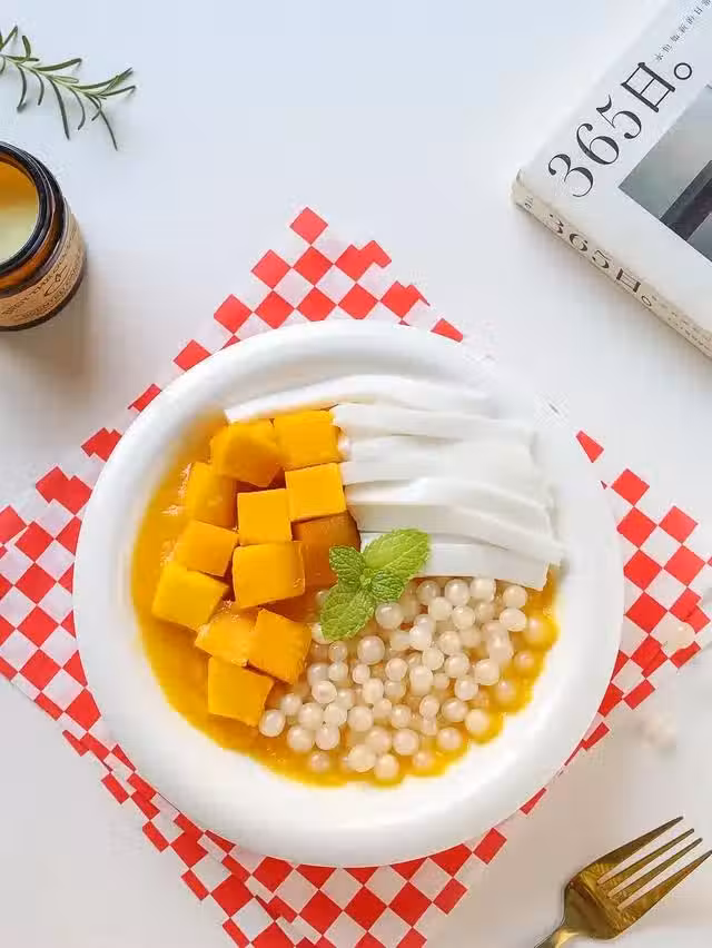 6.芒果泥打底,放入椰香河粉+芒果肉+爆爆珠,點綴下薄荷葉即可