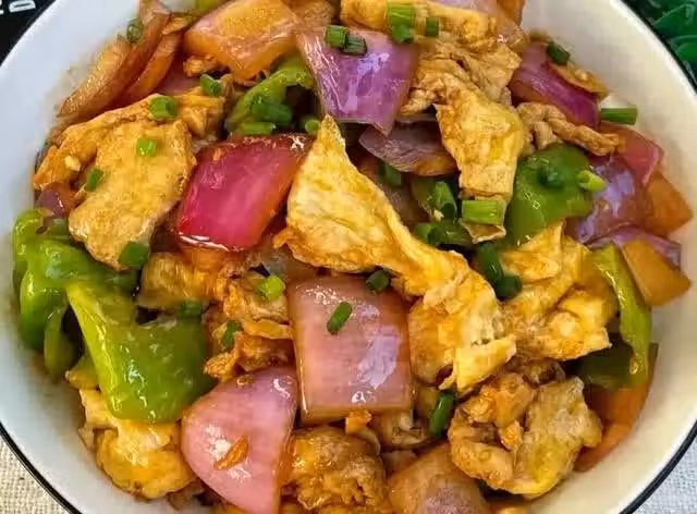 (4)鍋底留油,放入蒜瓣煸炒出香味,再放入洋蔥和青椒,大火翻炒至斷生。