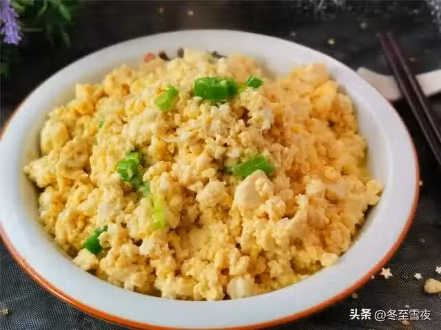5.將打散的蛋液淋入,繼續翻炒,將雞蛋液和豆腐一起翻炒成塊,一定要將豆腐中的水分炒走一部分,這樣才能成塊狀。再加入鹽,白鬍椒粉和剩下另一半的蔥花,一起翻炒均勻,關火,盛出裝盤即可。一盤雞刨豆腐就做好了。