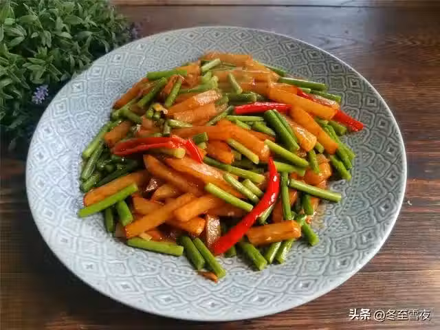 8.下入炸好的蒜苔和土豆條,快速翻炒幾下,芡汁均勻地裹在食材上,關火,盛出裝盤,一道色香味俱全的菜肴就做好了。