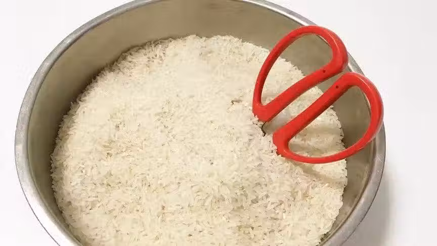 2、防止剪刀生銹。把剪刀用保鮮膜給它包裹起來,然後插到大米裡面,因為大米比較乾燥能夠起到防止生銹的作用,用保鮮膜包裹起來這樣儲存的話,大米也還是可以繼續吃的不用擔心。
