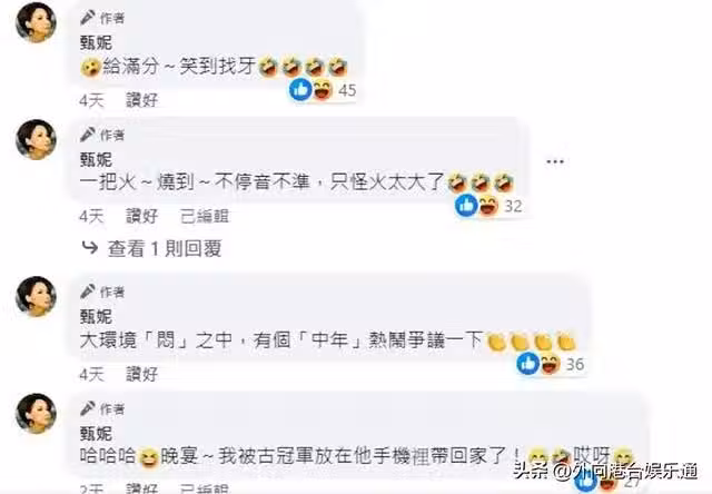 而眼見大家如此捧場,甄妮也是非常高興,因此馬上就在留言區加大力度攻擊:「哦!原來評審喜歡油膩誇張精!唉,老油條,沒有成長的空間!」