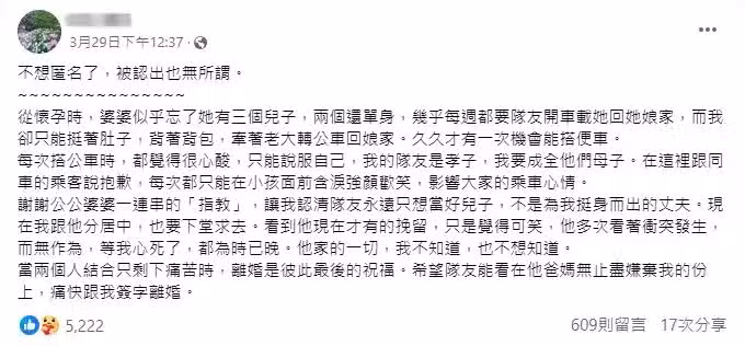 也有網友分享:「曾經的我,遇到婆婆找麻煩,到處說我的不是,我老公是孝子,我不想讓他為難,而不願意解釋。不過,我的心生病了,幸好有宗教跟家人及朋友的支持,我撐過來,老公默默看著我的付出,漸漸知道一切事實,所以婆婆的造謠中傷,已經完全起不了任何傷害!」、「我也曾背著孩子、手裡再牽一個,坐火車回娘家,路人好心幫我提行李,現在回想起來好可悲...」