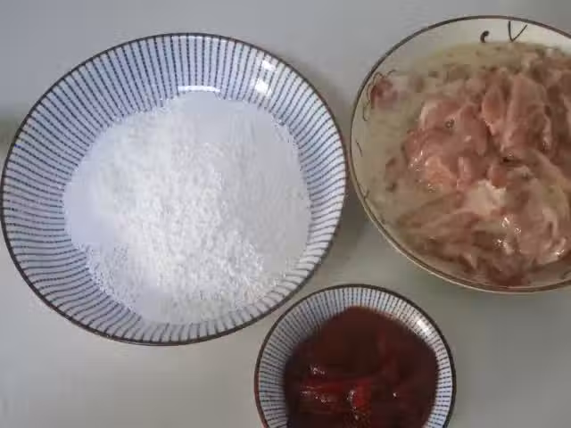 備好紅薯粉,番茄醬,豬肉片用鹽,黃酒,生粉,蛋清抓勻靜置半小時