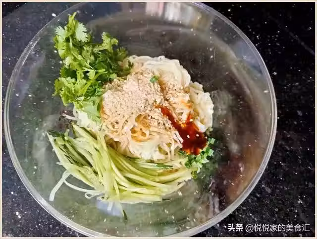 【第三步】:然後把過涼的麵條放入大碗中,再根據個人口味加入香醋,香油,和生抽,加入一勺食用鹽,放入黃瓜絲,香菜,花生米和白芝麻,接下來炒鍋洗凈,放少許食用油,放入一把花椒,炸出花椒的香味之後把花椒撈出來丟掉,然後趁熱把油澆在蒜末炸出香味,充分攪拌均勻之後就可以開吃了。